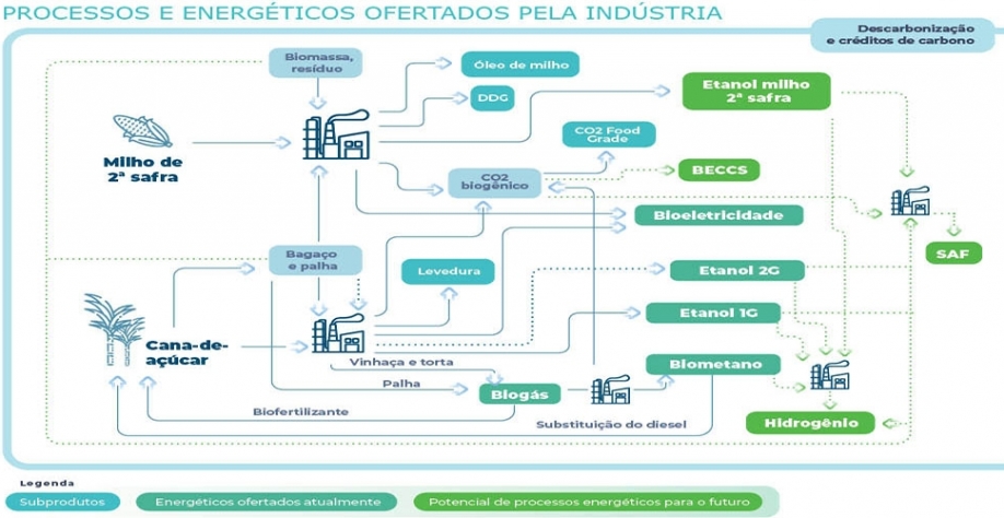 Hoje, além do etanol de cana e da bioeletricidade, essa indústria conta com a produção de etanol de milho de segunda safra, de etanol de segunda geração, de biogás, de biometano e de créditos de descarbonização. Trata-se de um crescimento expressivo no portfólio de energéticos em apenas uma década. Isso sem contar os inúmeros subprodutos gerados, como é o caso da levedura seca, do óleo de milho, do CO2 biogênico e do DDG, por exemplo.
