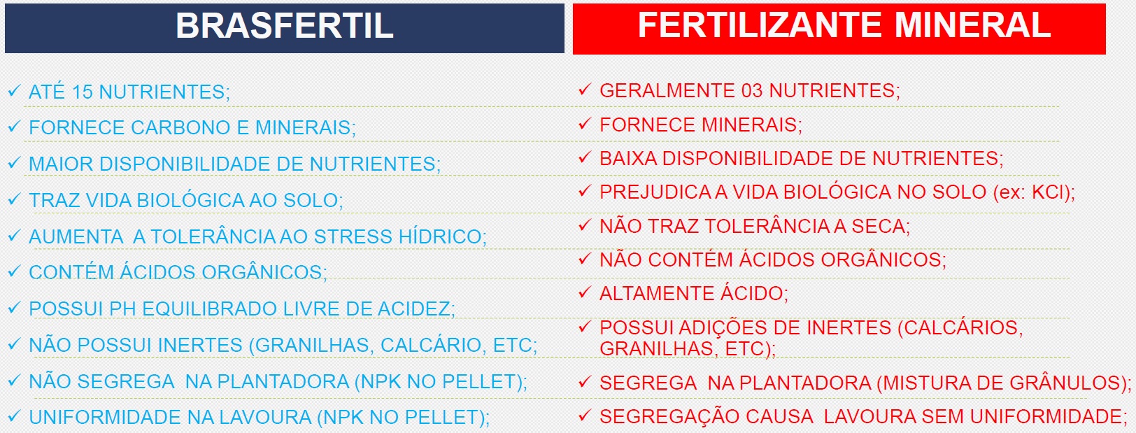 O profissional reforça ainda que o fertilizante mineral convencional atua somente na propriedade química do solo, acarretando vários problemas, como aumento rápido e momentâneo das concentrações de nutrientes na solução, estresse químico, destruição e queima de radicelas, diminuição da produção de citocinina e da quantidade de estômatos, enfraquecimento do sistema radicular e menores taxas de absorção de nutrientes e de formação de folhas além de prejudicar a microbiota do solo.