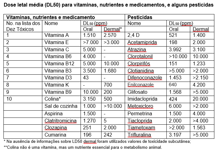 A tabela abaixo apresenta duas listas. A primeira delas contém vitaminas, nutrientes e medicamentos, incluindo a lista do "Dez Tóxicos", exposta anteriormente. A outra é de pesticidas (inseticidas, fungicidas e herbicidas). Pode ser verificado que todas elas apresentam um determinado grau de toxicidade, medido em partes por milhão (ppm). Os quais giram, aproximadamente, em torno dos mesmos valores. Ou seja, há similaridade na toxicidade de vitaminas e pesticidas, a dose é que vai estabelecer se há ou não risco à saúde.