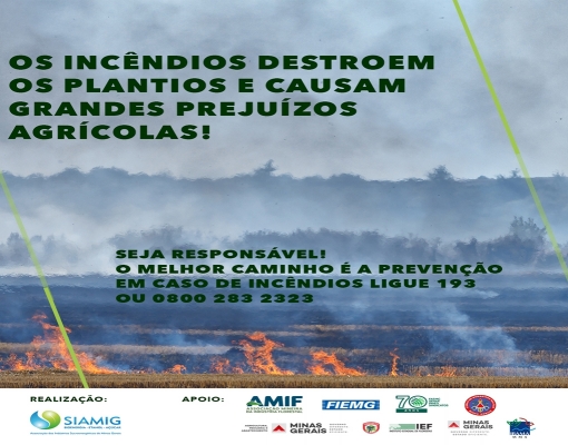 A SIAMIG lançou, hoje até 30 de setembro, a Campanha “Unidos na prevenção aos incêndios rurais 2021”, com a veiculação de vídeos e posts para rede social e whatsapp, além de material para produção de outdoors, busdoor, placas e spots para rádio. A campanha conta com o engajamento das 34 associadas da entidade e o apoio na divulgação dos parceiros: IBAMA, CBMMG (Corpo de Bombeiros Militar de Minas Gerais), IEF (Instituto Estadual de Florestas), Secretaria de Estado de Agricultura, Pecuária e Abastecimento (SEAPA), FAEMG (Federação da Agricultura do Estado de Minas Gerais), FIEMG (Federação das Indústrias do Estado de Minas Gerais), e AMIF (Associação Mineira da Indústria Florestal).