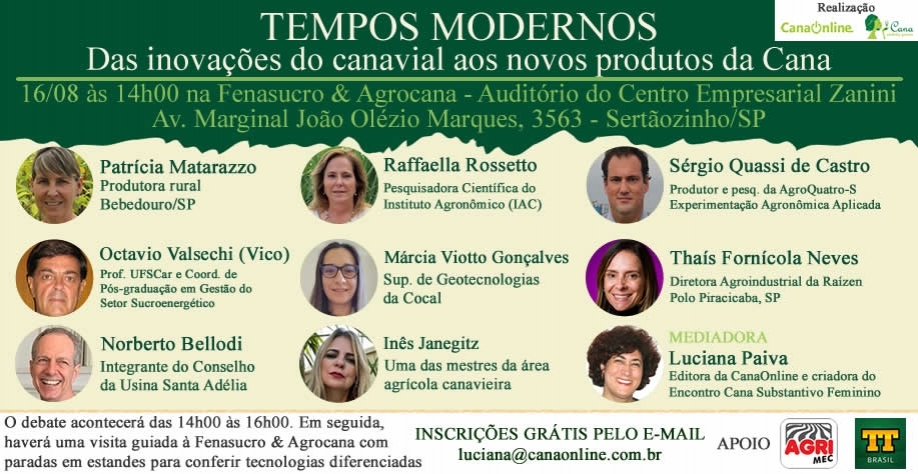 É o debate que a CanaOnline e o Cana Substantivo Feminino promoverão em 16 de agosto (terça-feira) a partir das 14h00 na Fenasucro & Agrocana. Para participar, envie e-mail para luciana@canaonline.com.br