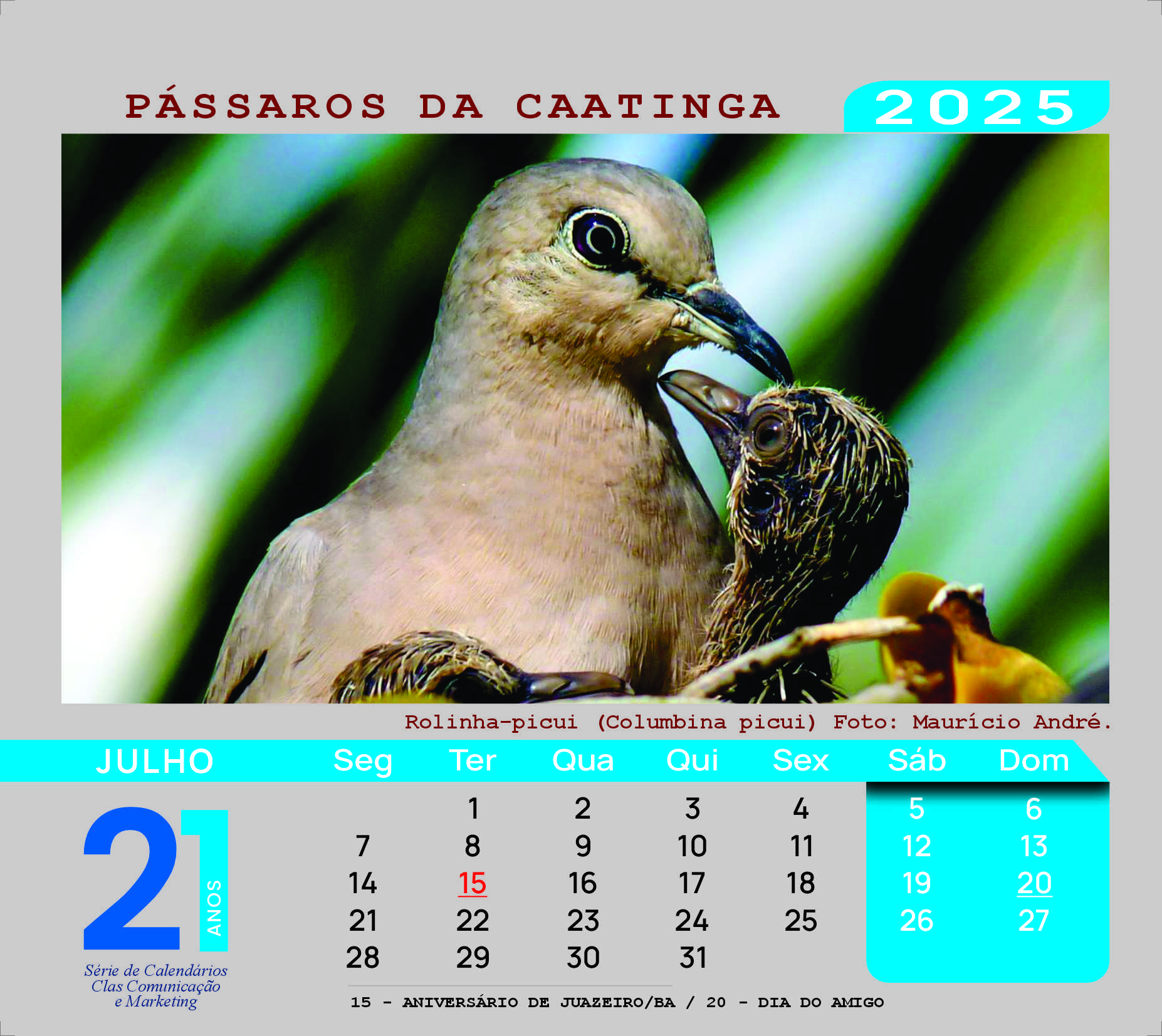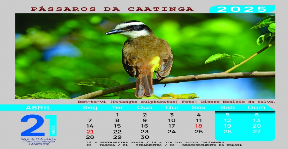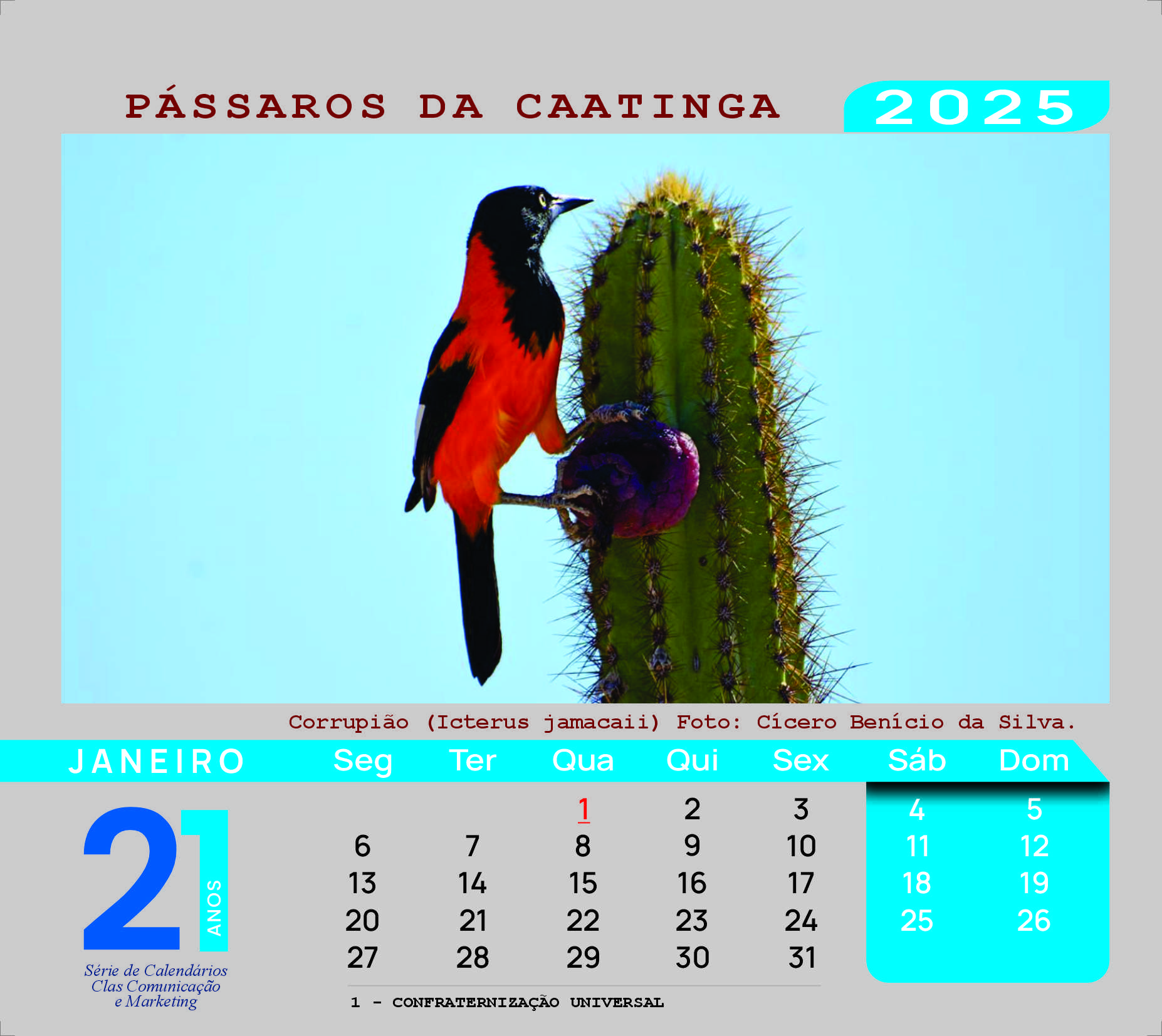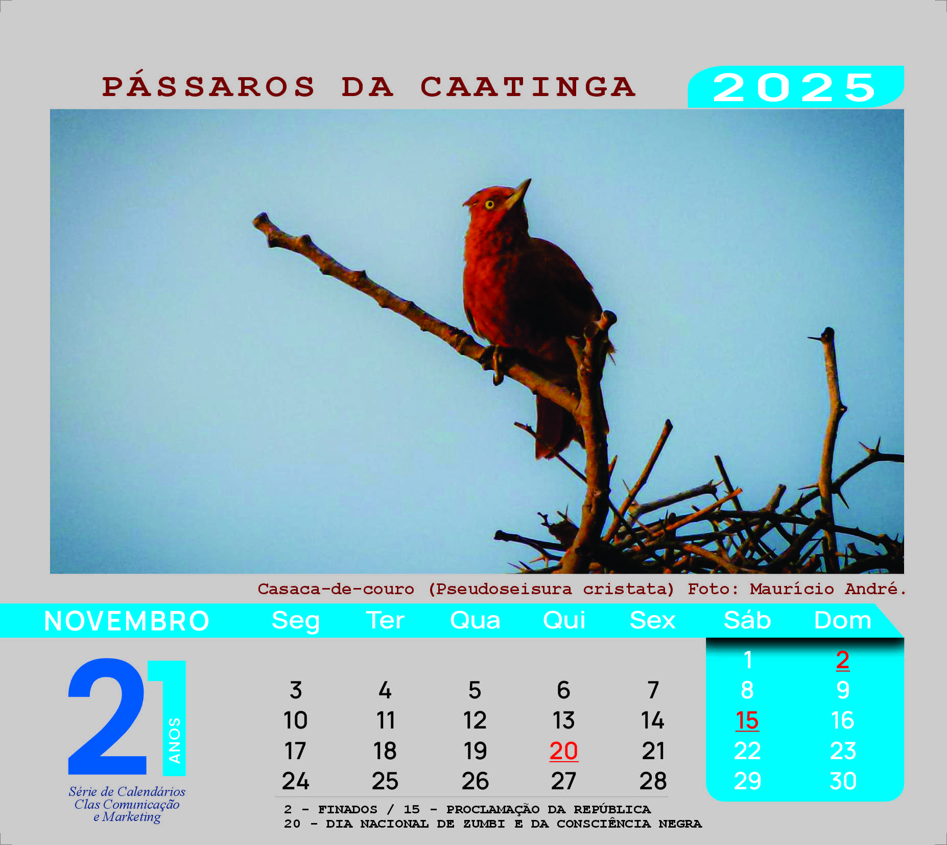 A Série de Calendários da Clas Comunicação e Marketing, em parceria com a Cadan Distribuição, Gráfica Bandeirante e a Agrovale, foi buscar no único bioma exclusivamente brasileiro, o tema da edição de 21 anos: 'Os Pássaros da Caatinga'.