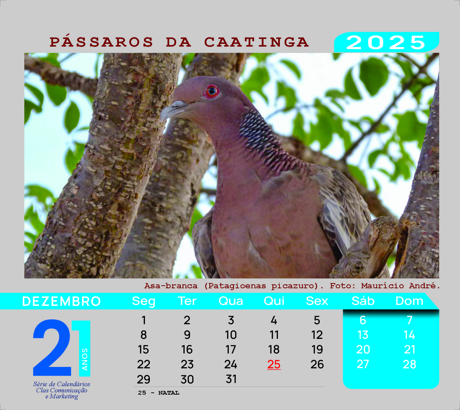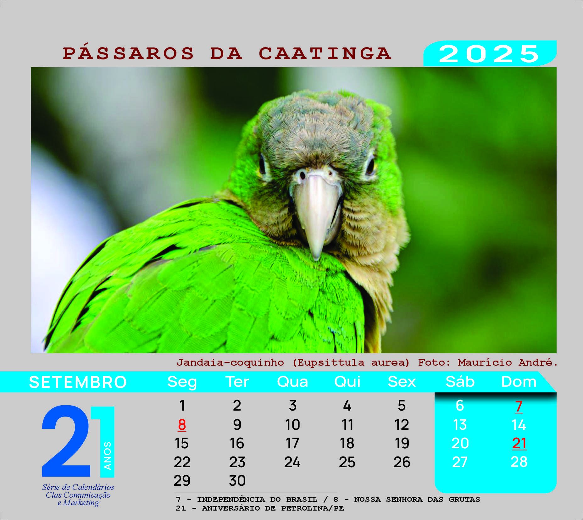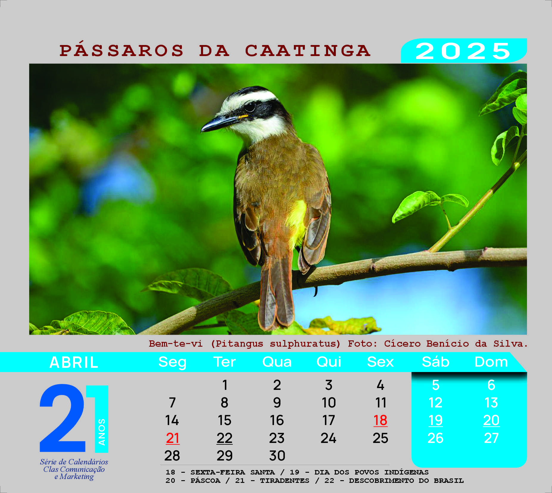 A Série de Calendários da Clas Comunicação e Marketing, em parceria com a Cadan Distribuição, Gráfica Bandeirante e a Agrovale, foi buscar no único bioma exclusivamente brasileiro, o tema da edição de 21 anos: 'Os Pássaros da Caatinga'.