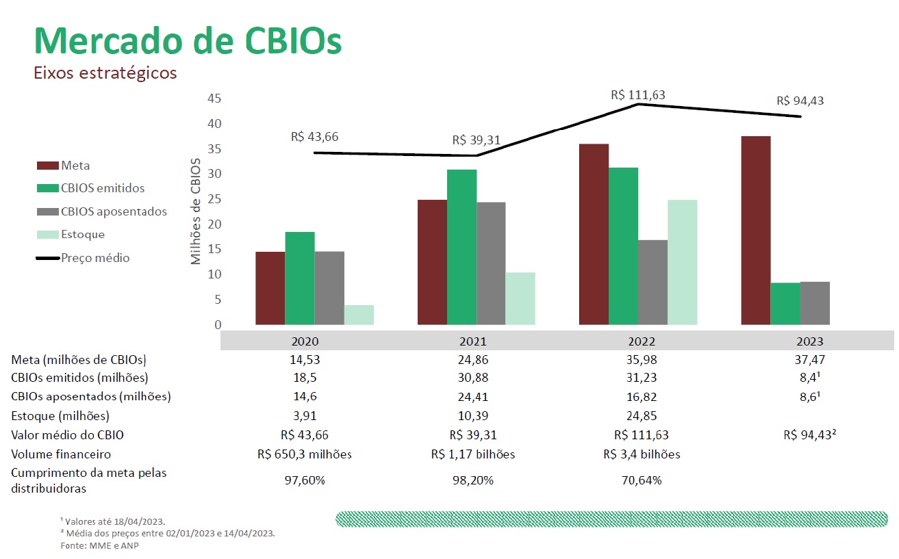 Principal ativo da Política Nacional de Biocombustível (RenovaBio), o CBIO funciona como uma espécie de “moeda de troca”. Produtoras de biocombustíveis certificadas podem gerar lastro para emissão e comercialização desses créditos. O volume a ser emitido dependerá da Nota de Eficiência Energética-Ambiental (NEEA) de cada empresa, calculada com base na pegada de carbono envolvida na produção. Em 2022, foram emitidos pouco mais de 31 milhões de CBIOs.