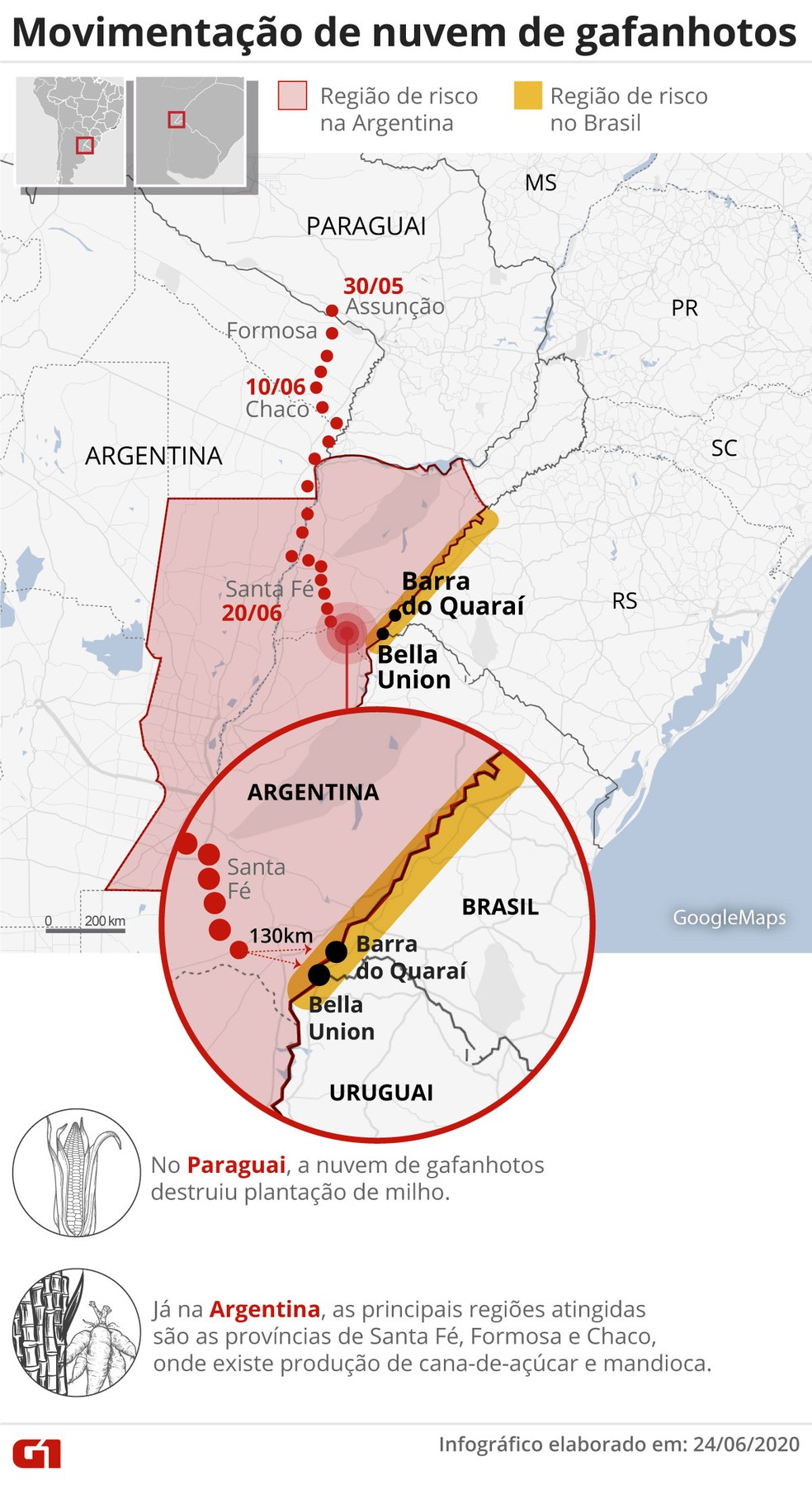 A nuvem de gafanhotos que avança pela Argentina está a 130 km em linha reta do município brasileiro de Barra do Quaraí, no oeste do Rio Grande do Sul, de acordo com o último levantamento do governo argentino. Para meteorologistas, a chegada vai depender da condição climática no Sul nos próximos dias.