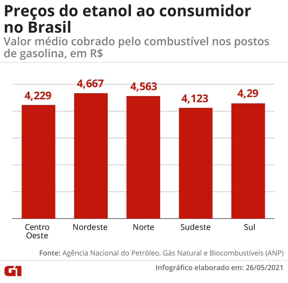 Na região Sudeste, por sua vez, o valor médio do etanol no acumulado do mês é de R$ 4,123, mas chegou a registrar até R$ 5,999.