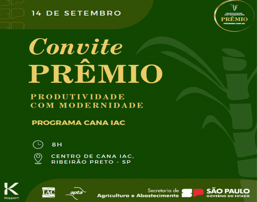 Inscrições pelo link https://www.sympla.com.br/premio-programa-cana-iac-de-produtividade__2116349