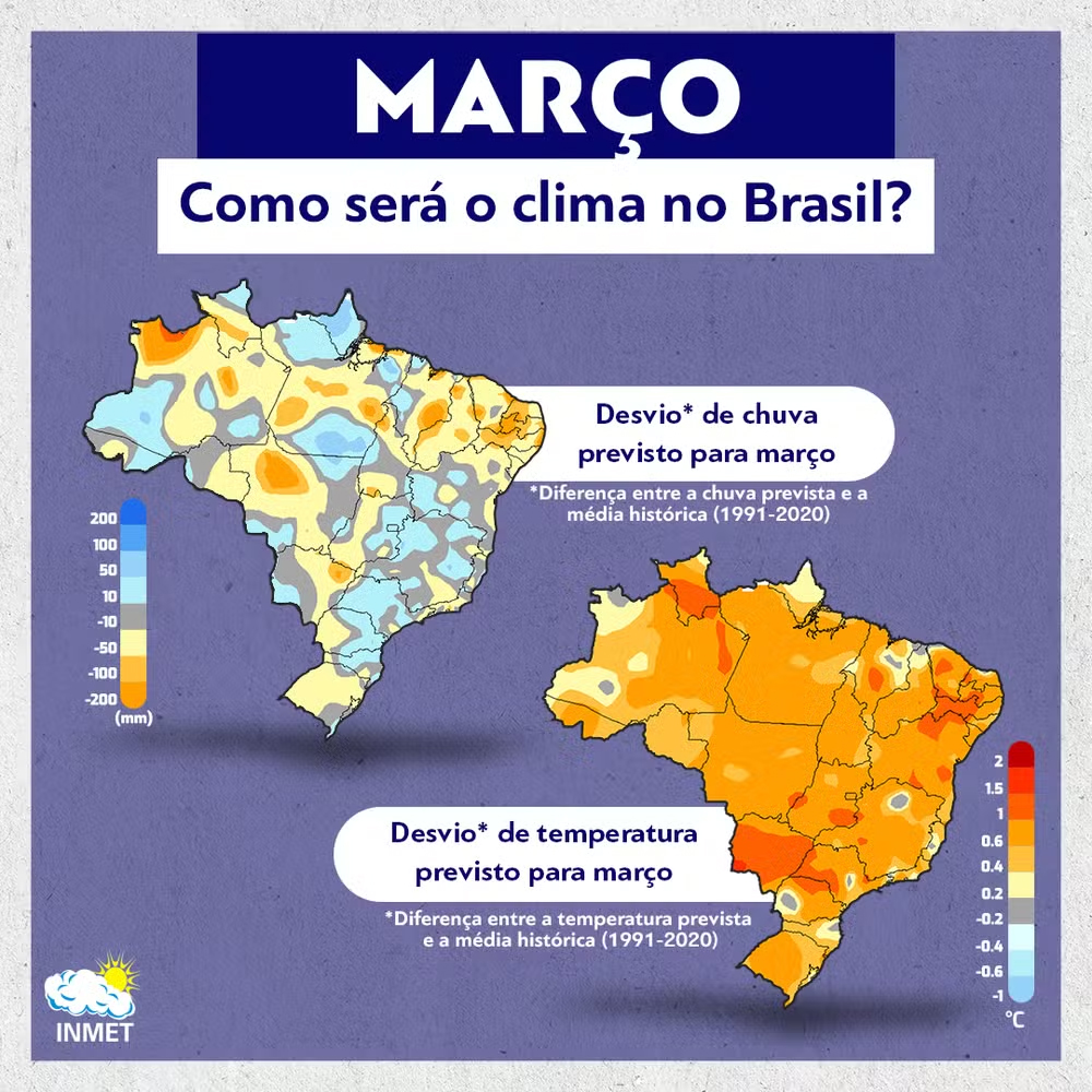 Mapa de previsão de chuva e temperaturas para março de 2024