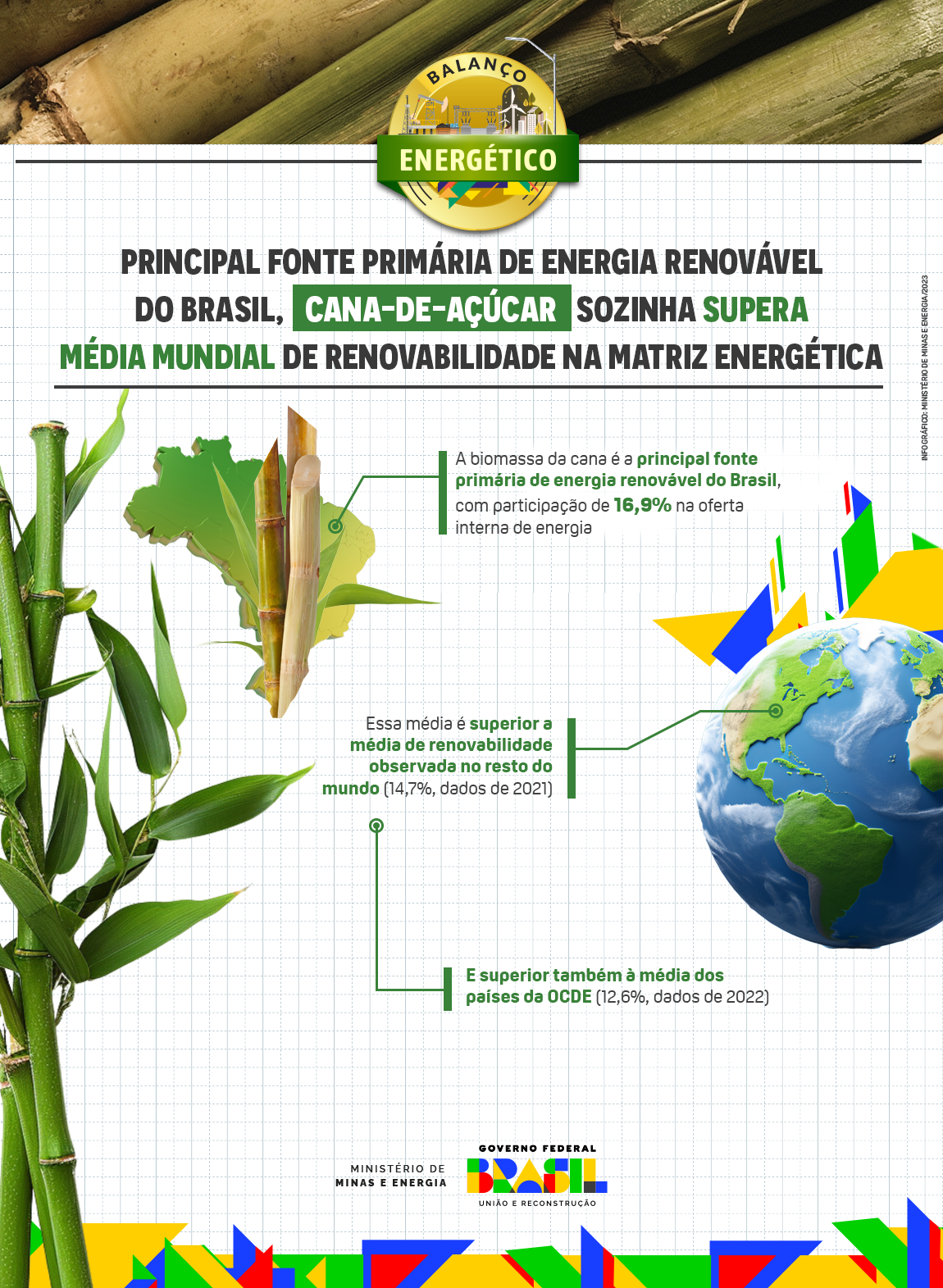 Acana-de-açúcar é a principal fonte primária de energia renovável do Brasil. Com 16,9% de participação na Oferta Interna de Energia (OIE) do país, a biomassa da cana ultrapassa a média de renovabilidade observada no resto do mundo, em torno de 14,7%. Esse percentual, observado no Balanço Energético Nacional (BEN) 2024 – elaborado pela Empresa de Pesquisa Energética (EPE) em parceria com o Ministério de Minas e Energia (MME) – também é superior aos 12,6% observados nos países da Organização para a Cooperação e Desenvolvimento Econômico (OCDE).