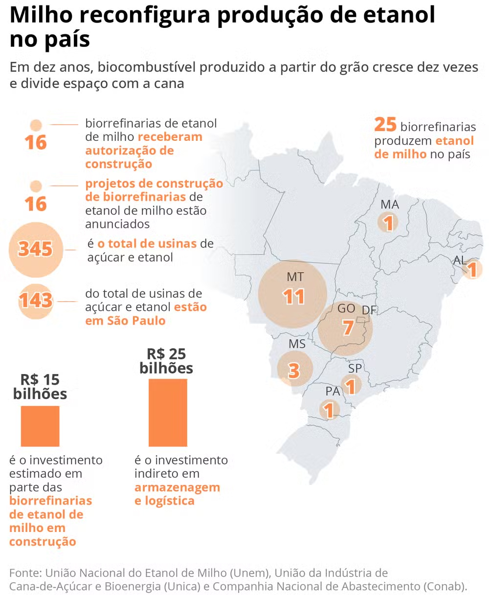 No total, são 25 biorrefinarias de etanol de milho no país. Mais 16 unidades têm autorização de construção, conforme a Unem, que mapeou outros 16 projetos em planejamento.