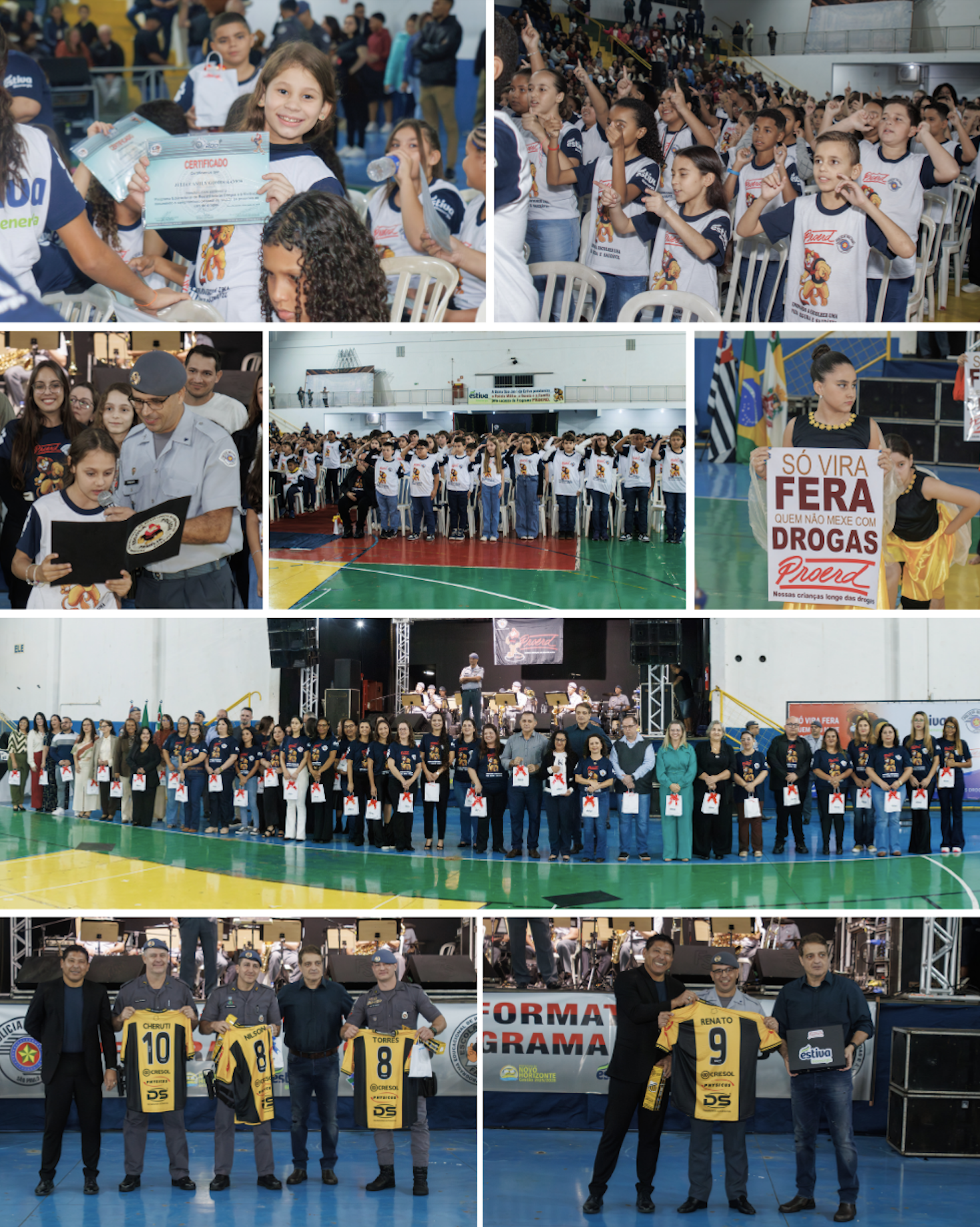 A cerimônia foi marcada por discursos, premiações e apresentações. Autoridades, comandantes da Polícia Militar, professores, representantes das escolas participantes e da Usina Estiva prestigiaram o evento, entre eles o comandante do CPI-5 da Polícia Militar, o Coronel Nilson César Pereira, e o prefeito Fabiano Belentani.