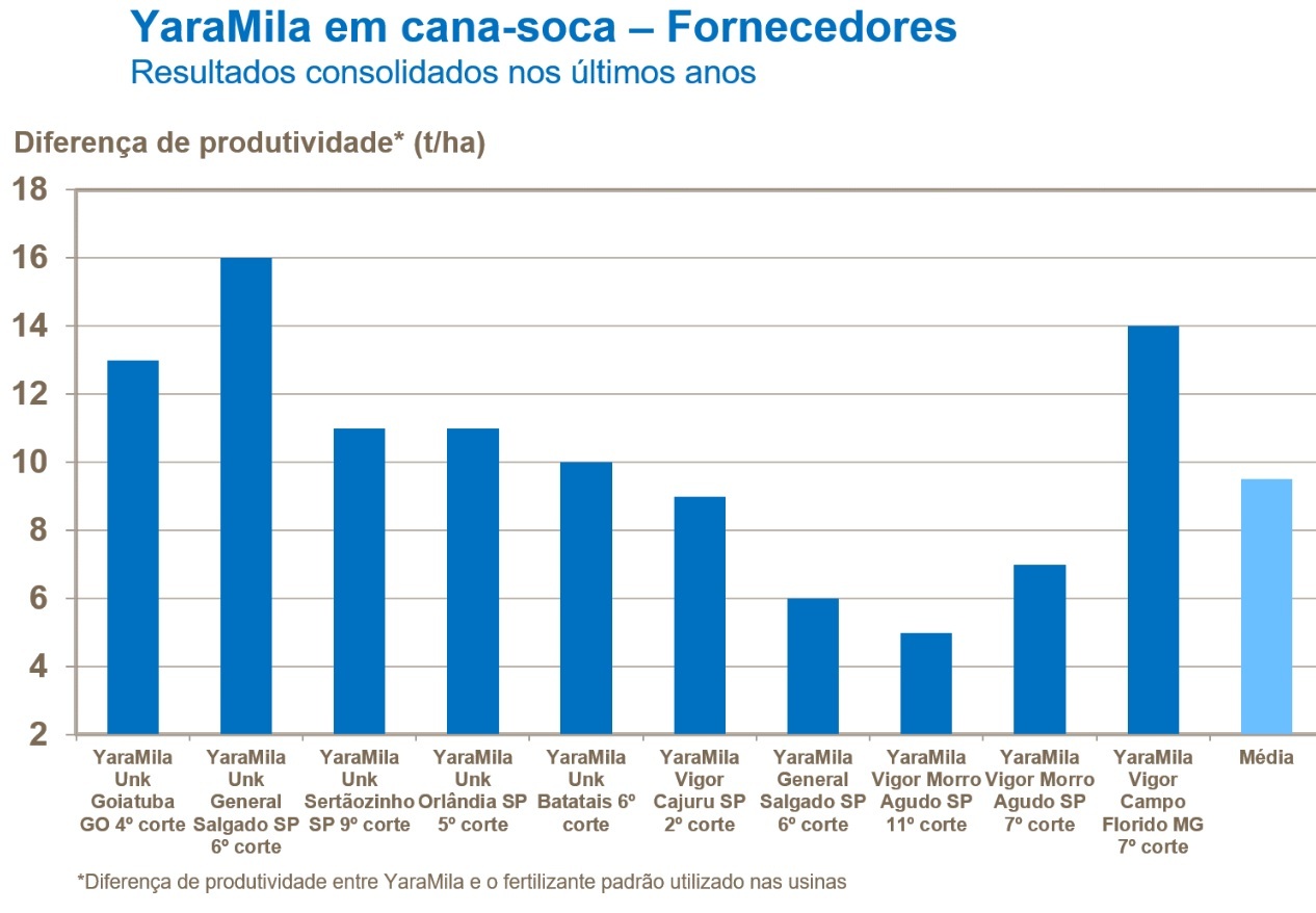 Mas não é apenas o sulco de plantio que se beneficia da linha de produtos da Yara. Nogueira conta que, logo após a colheita, as socarias também recebem atenção. “Depois do plantio, temos a complementação nutricional com o YaraMila, um produto específico para cana-soca.”