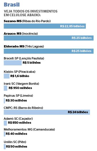 Os investimentos no Estado decorrem de três empreendimentos desta década: o Projeto Cerrado da Suzano, em Ribas do Rio Pardo, inaugurado no mês passado, que recebeu R$ 22,8 bilhões para se tornar realidade; a planta processadora da Arauco em Inocência, que receberá um aporte de R$ 25 bilhões da multinacional chilena; e a segunda linha de produção da Eldorado Brasil Celulose em Três Lagoas, que também terá um investimento de R$ 25 bilhões.