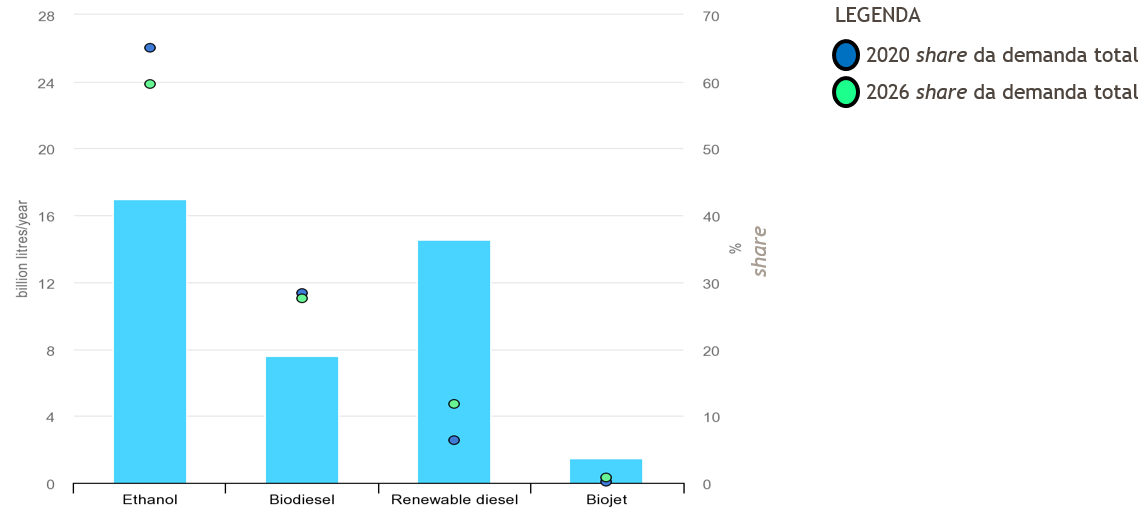 Figura 1 – estimativa de crescimento da demanda de biocombustíveis no mundo entre 2020 e 2026 (Fonte: adaptado de IEA, 2022)