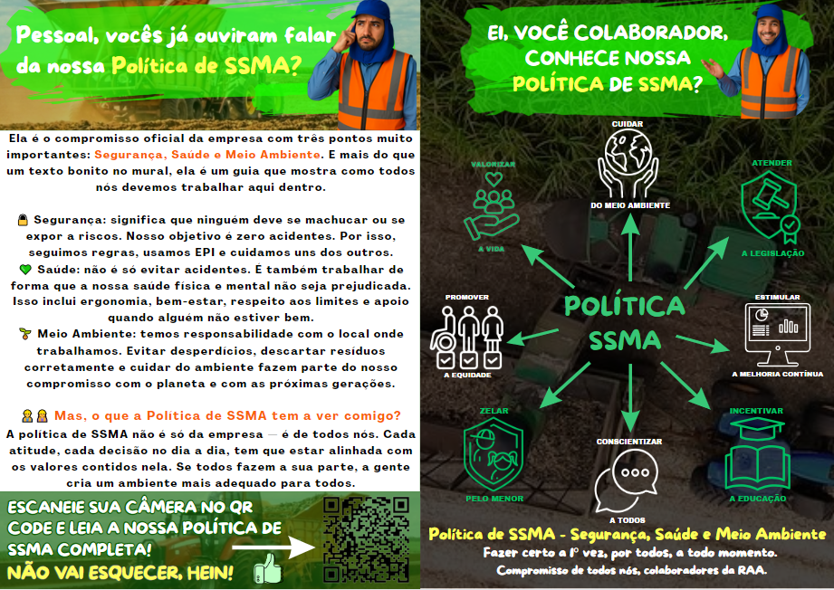 Esses momentos de troca são fundamentais para garantir que os colaboradores conheçam e se comprometam com os princípios que orientam nossas ações em saúde, segurança e meio ambiente. Mais do que um documento, a Política de SSMA é um guia que reflete os valores da RAA e deve ser vivenciada por todos no dia a dia.
