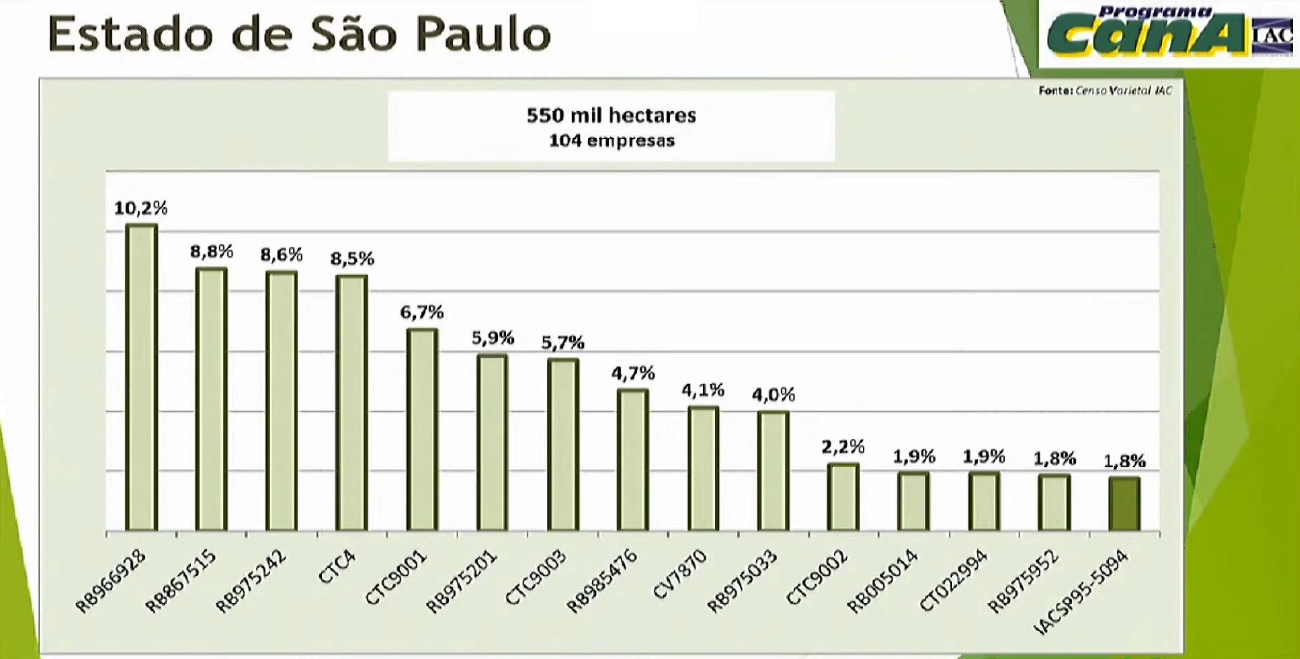 Em São Paulo, principal estado produtor de cana-de-açúcar do Brasil, a variedade com maior intenção de plantio é a RB966928, com 10,2% de representatividade. Em seguida, aparecem a RB867515 (8,8%), RB975242 (8,6%), CTC4 (8,5%) e CTC9001 (6,7%). A RB966928 também será predominante em terras mineiras, com 9,7% de participação. RB975242 (8,2%), IACSP01-5503 (5,8%), CTC4 (5,5%) e RB867515 (5,5%) completam o ranking do estado.