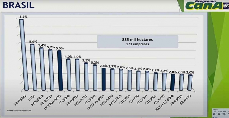 Em São Paulo, maior produtor nacional, o material também aparece como líder do ranking, com 11,6% de área, seguido pela RB966928 (5,7%), CTC4 (5,6%), RB975201 (5,1%), CTC9006 (4,6%) e RB867515 (4,3%).