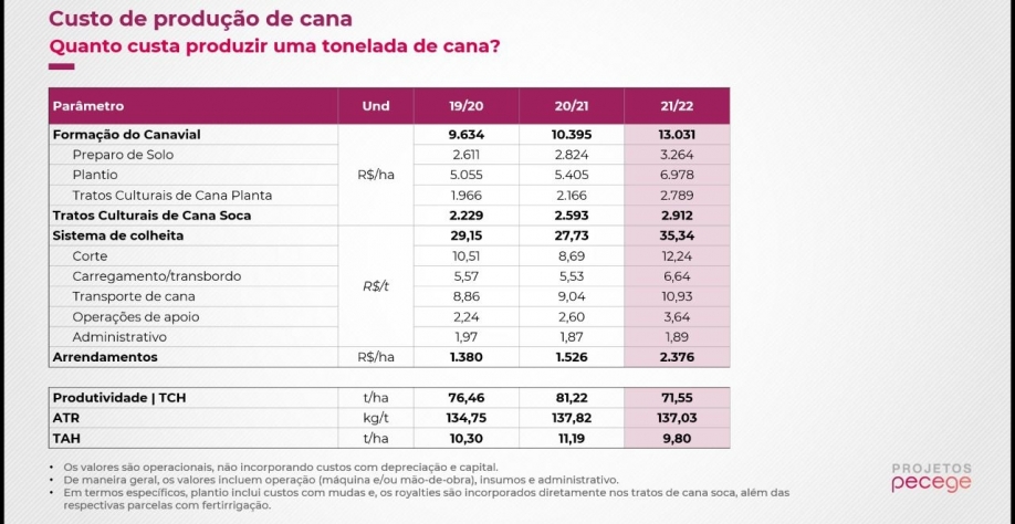 Em resumo, os custos para cultivar um hectare (R$/ha) aumentaram e, a quantidade de cana produzida pela mesma unidade de área (popular, produtividade), caiu. Resultado, aumento no custo de produção da tonelada em 40%.
