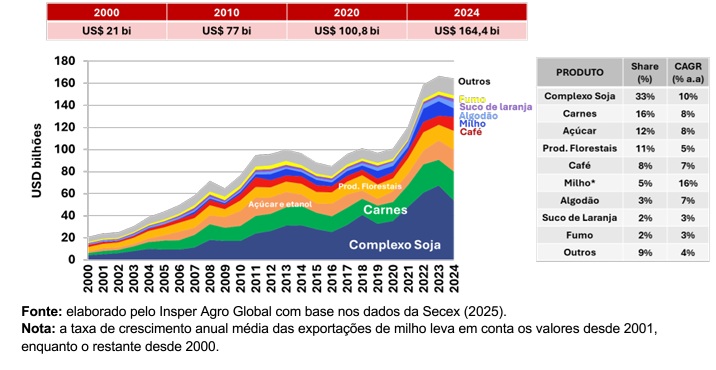 Diante disso, a estratégia do Brasil deve focar na diversificação de mercados e na manutenção de sua competitividade global, consolidando-se como líder em segmentos estratégicos do agronegócio conclui o Insper Agro Global.