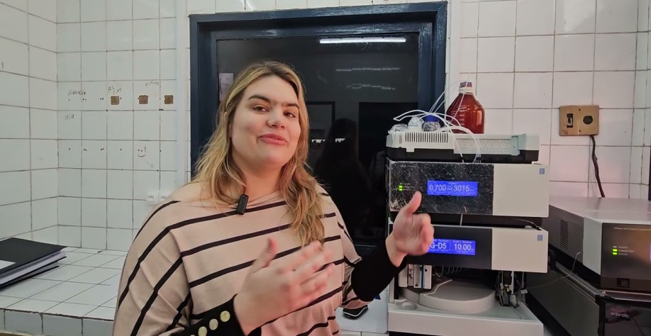 Na visita do Tour da CanaOnline pelo Nordeste Canavieiro, a jornalista Luciana Paiva conferiu na São José Agroindustrial o uso de tecnologia de ponta no laboratório da indústria. Myllena Carvalho, Especialista de Processo, apresentou o equipamento chamado HPLC líquido, um cromatógrafo de alta eficiência.