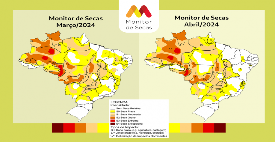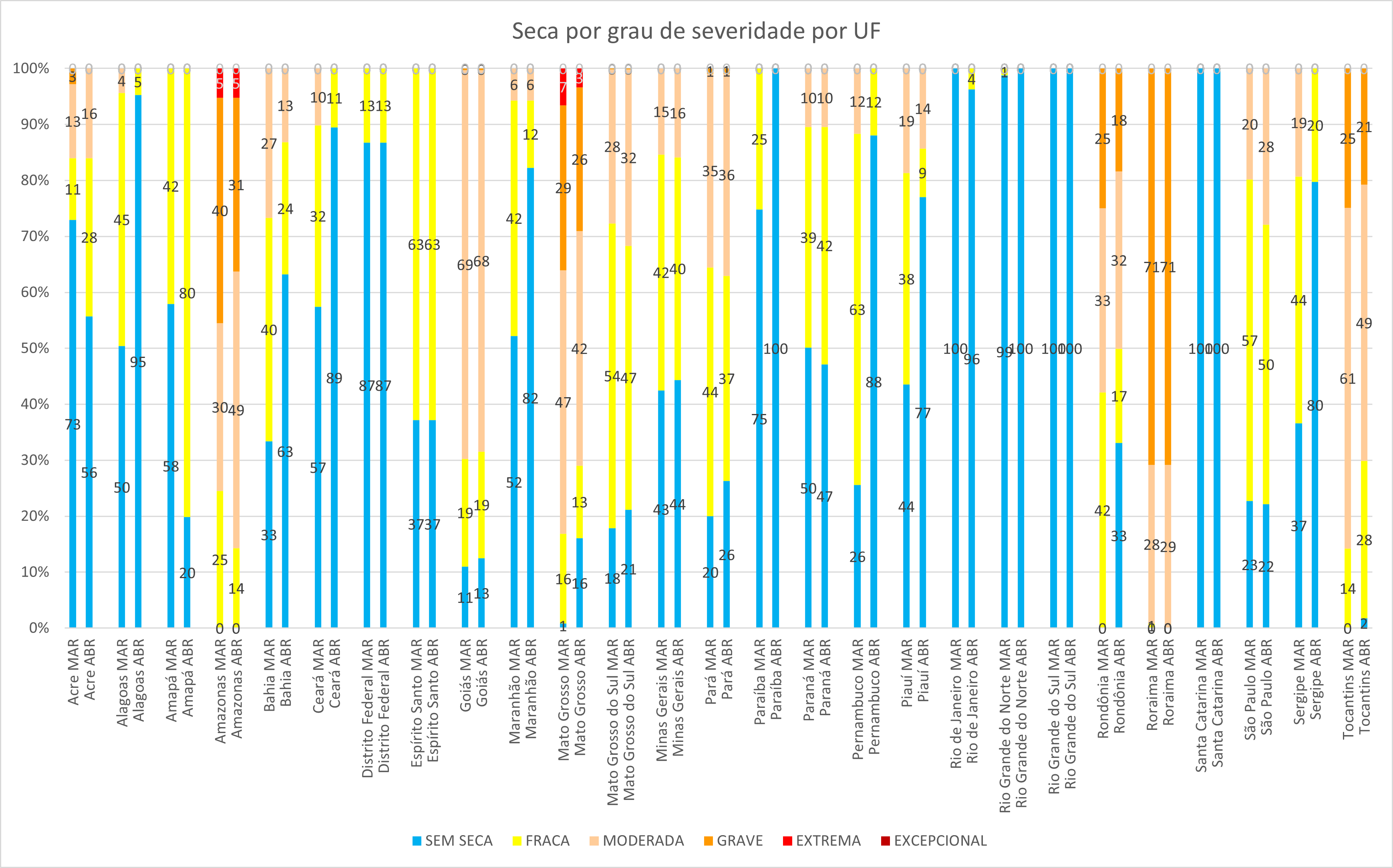 Entre março e abril, em termos de severidade da seca, houve um abrandamento do fenômeno em 12 unidades da Federação, conforme a última atualização do Monitor de Secas: Acre, Alagoas, Amazonas, Bahia, Ceará, Goiás, Mato Grosso, Pernambuco, Piauí, Rondônia, Sergipe e Tocantins. Já em outros três estados a seca se intensificou nesse período: Mato Grosso do Sul, Pará e São Paulo. No caso do Rio de Janeiro, o fenômeno voltou a ser registrado. Em termos de severidade, a seca ficou estável em sete unidades da Federação: Amapá, Distrito Federal, Espírito Santo, Maranhão, Minas Gerais, Paraná e Roraima. Já no Rio Grande do Sul e em Santa Catarina não houve registro do fenômeno, que deixou de ser verificado tanto na Paraíba quanto no Rio Grande do Norte.