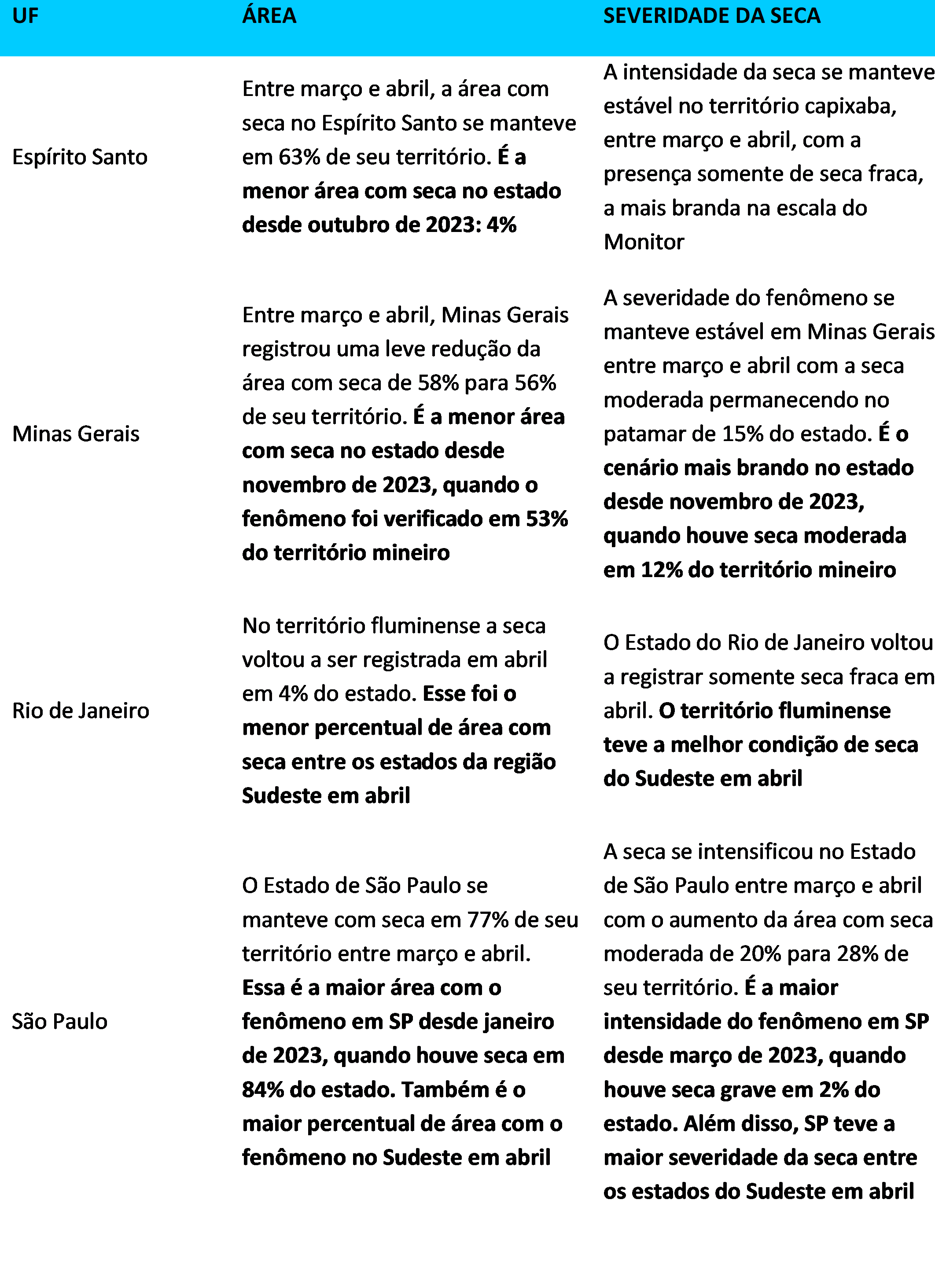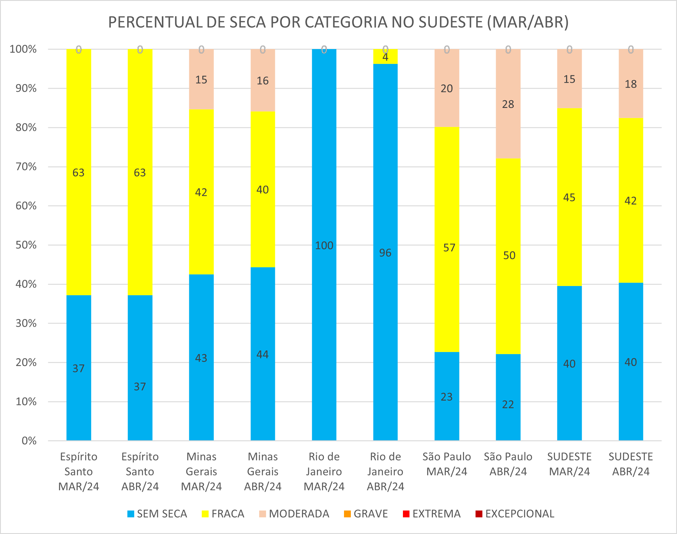 Na comparação entre março e abril, em termos de severidade da seca, houve uma intensificação do fenômeno no Estado de São Paulo com o aumento da área com seca moderada de 20% para 28% do território paulista, o que contribuiu para o aumento da intensidade da seca na região Sudeste. Tanto no Espírito Santo quanto em Minas Gerais a severidade da seca se manteve estável nesse período. Já o Estado do Rio de Janeiro voltou a registrar seca fraca entre março e abril em 4% do território fluminense. Com a situação de SP, a área com seca moderada na região Sudeste como um todo aumentou de 15% para 18% do total, indicando uma intensificação regional da seca.
