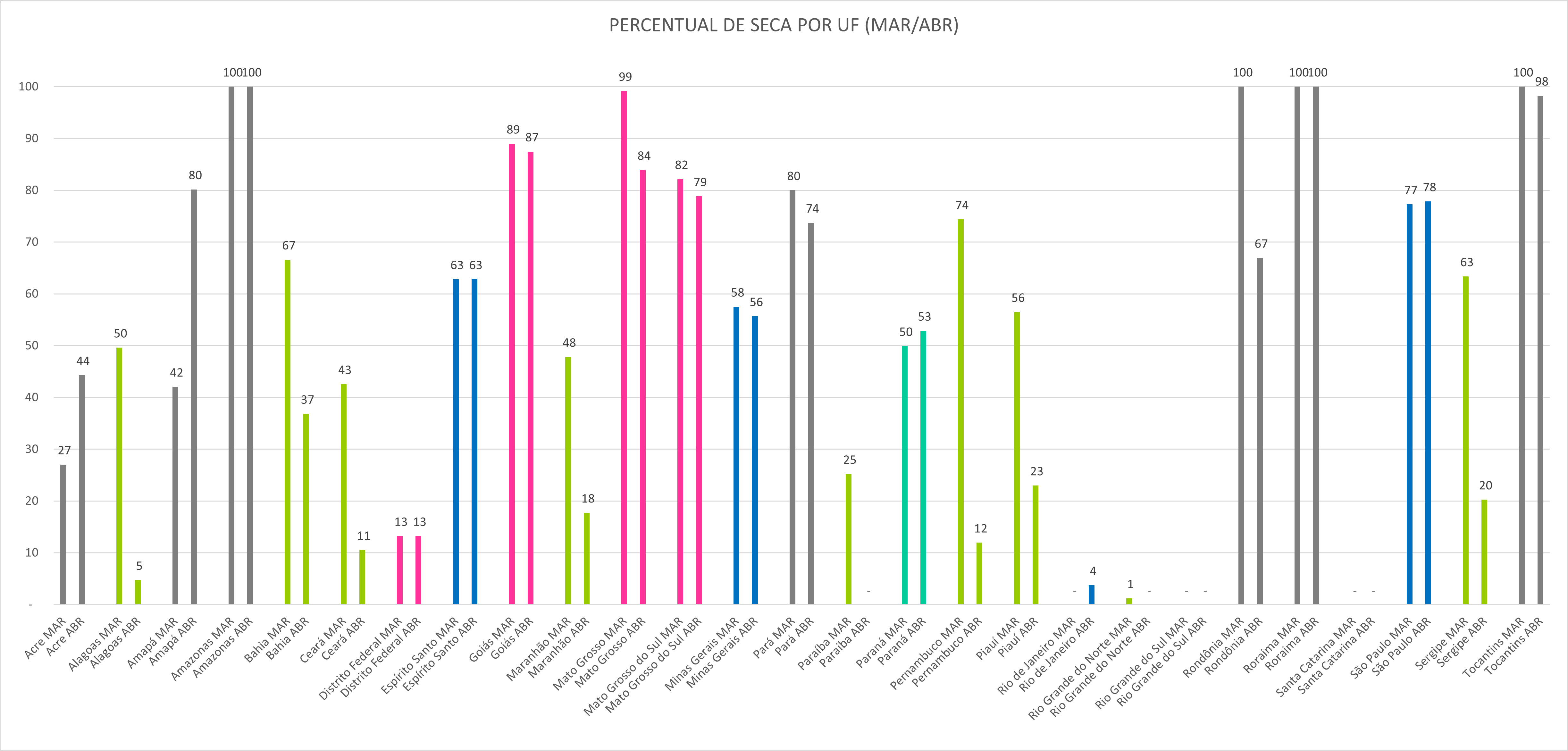 Na comparação entre março e abril, três estados registraram o aumento da área com seca: Acre, Amapá e Paraná. No Rio de Janeiro o fenômeno voltou a ser registrado. Em 14 unidades da Federação houve uma diminuição da extensão da seca: Alagoas, Bahia, Ceará, Goiás, Maranhão, Mato Grosso, Mato Grosso do Sul, Minas Gerais, Pará, Pernambuco, Piauí, Rondônia, Sergipe e Tocantins. Em outras cinco unidades da Federação, a área com o fenômeno se manteve estável: Amazonas, Distrito Federal, Espírito Santo, Roraima e São Paulo. Já o Rio Grande do Sul e Santa Catarina seguiram livres de seca em abril, mês em que a Paraíba e o Rio Grande do Norte deixaram de registrar o fenômeno.