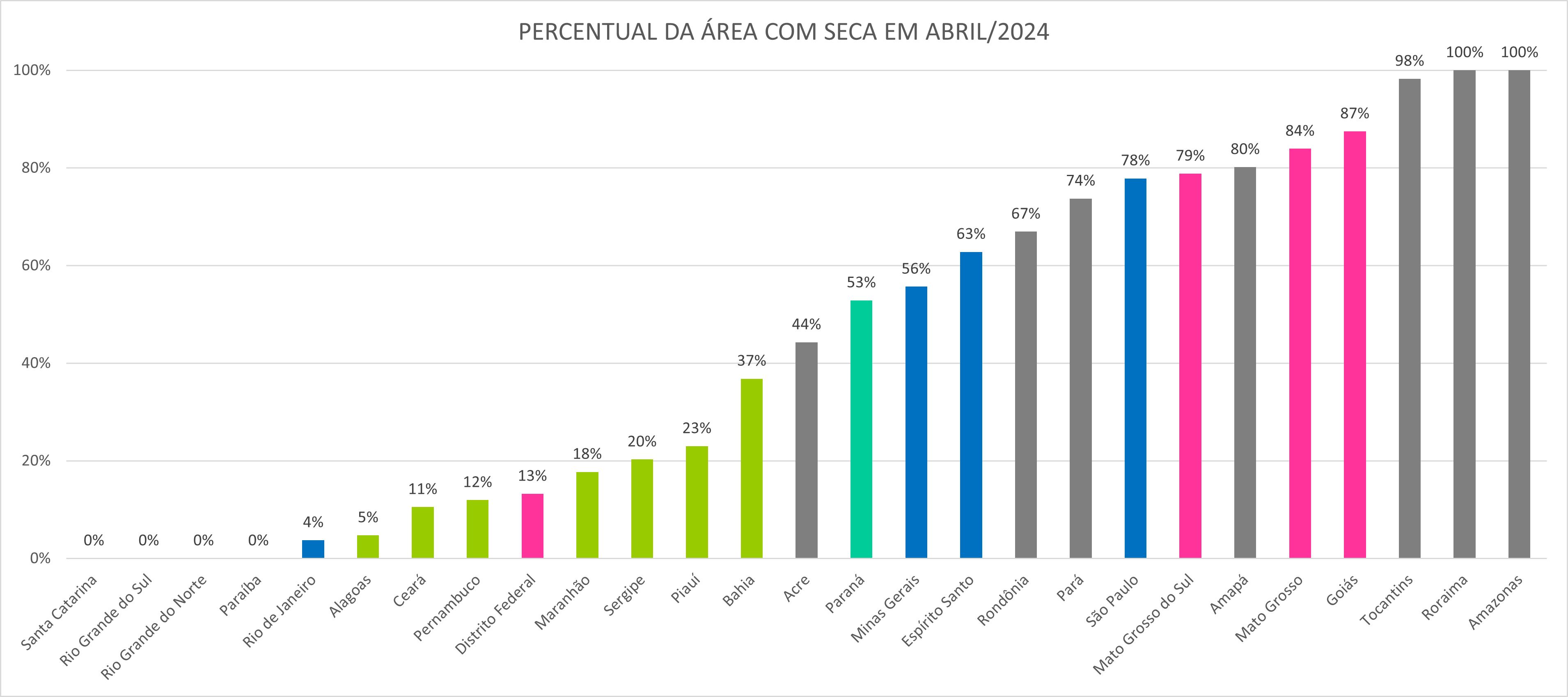 Duas unidades da Federação registraram seca em 100% do território em abril deste ano: Amazonas e Roraima. Para percentuais acima de 99% considera-se a totalidade dos territórios com seca. Nas demais unidades da Federação que registraram área com seca, os percentuais variaram de 4% a 98%.