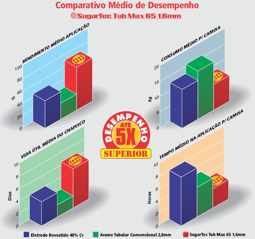 O gerente do segmento de açúcar e álcool da Eutectic do Brasil, Marcelo Domingues, afirma que as usinas sucroenergéticas se beneficiarão grandemente do SugarTec Tub Max 65 1,6 mm. “O produto entrega maior pulverização da área, com consumo duas vezes menor quando comparado ao arame tubular convencional. Além disso, a vida útil do chapisco aplicado é até 1,5 vezes maior do que de eletrodos revestidos e até três vezes maior do que de arames tubulares convencionais. Sem falar da velocidade de aplicação, que será, em média, duas vezes mais rápida.”