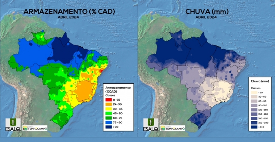 Os menores valores de armazenamento de água, entre 0 e 15%, foram registrados pontualmente em Sergipe. Em Minas Gerais e em grandes áreas do Rio de Janeiro, do Espírito Santo e da Bahia, o armazenamento ficou entre 15 e 30%. No restante da Bahia, em Alagoas e em grandes extensões de Pernambuco na Região Nordeste, em São Paulo no Sudeste e em Goiás no Centro-Oeste, os valores ficaram entre 30 e 45%. No restante da Região Nordeste, as condições foram diversificadas: na Paraíba, o armazenamento ficou entre 45 e 60%, no Rio Grande do Norte e no Piauí, prevaleceram valores entre 60 e 75%, no Ceará entre 75 e 90% e, no Maranhão, entre 75 e 90%. Roraima, na Região Norte, e Mato Grosso e Mato Grosso do Sul, na Região Centro-Oeste, registraram armazenamento de água no intervalo entre 45 e 75%. No Paraná e em Santa Catarina, a umidade do solo ficou entre 45 e 60%. Já no Rio Grande do Sul e no Acre, predominaram valores entre 60 e 75%. Nos demais estados da Região Norte, Tocantins registrou armazenamento entre 60 e 90%, Amazonas entre 75 e 90% e, no Pará e em Roraima, as condições foram mais favoráveis, onde foram registrados os maiores valores de armazenamento de água, superiores a 90%.