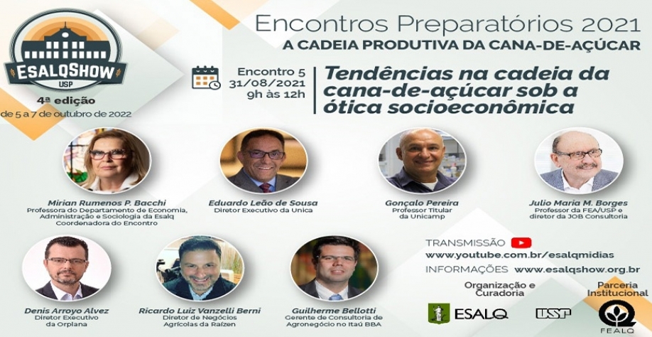 No próximo dia 31 de agosto, das 9h às 12h, ocorrerá o 5º Encontro Preparatório da 4ª edição do EsalqShow. A atividade será on-line, gratuita e reunirá representantes da academia e do setor produtivo que debaterão o tema "Tendências na cadeia da cana-de-açúcar sob a ótica socioeconômica".