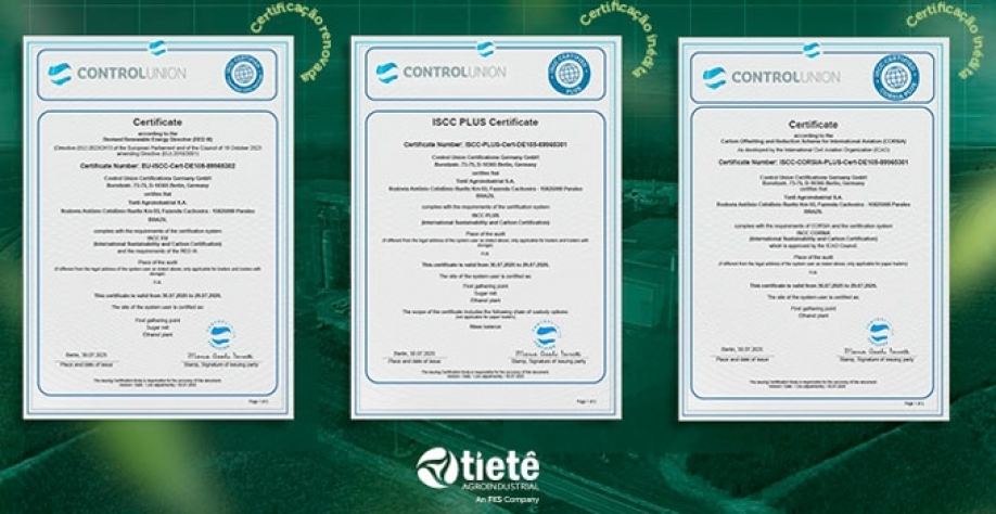 A Tietê Agroindustrial renovou a certificação internacional ISCC EU e conquistou, pela primeira vez, as certificações ISCC PLUS e ISCC CORSIA PLUS.