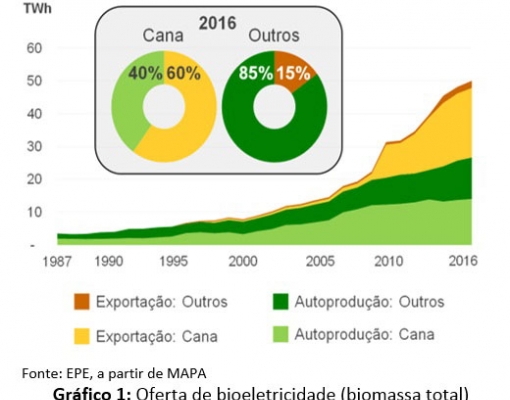 Observa-se que em 1987 toda a eletricidade gerada pelas usinas foi destinada, exclusivamente, para autoconsumo, não havendo exportação de energia para o SIN. Já em 2007, a quantidade de energia exportada alcançou 13 kWh por tonelada de cana moída. Com a participação das usinas sucroenergéticas nos leilões de energia elétrica e a eficientização do setor, a geração de energia para exportação aumentou para 34 kWh em 2016, por cada tonelada de cana processada no país. Avaliando somente as usinas vencedoras dos leilões de energia elétrica, evidencia-se que a geração e, consequentemente, a exportação de energia pode ser muito maior. Para este grupo o fator médio de exportação ao SIN é de 72 kWh por tonelada de cana processada.