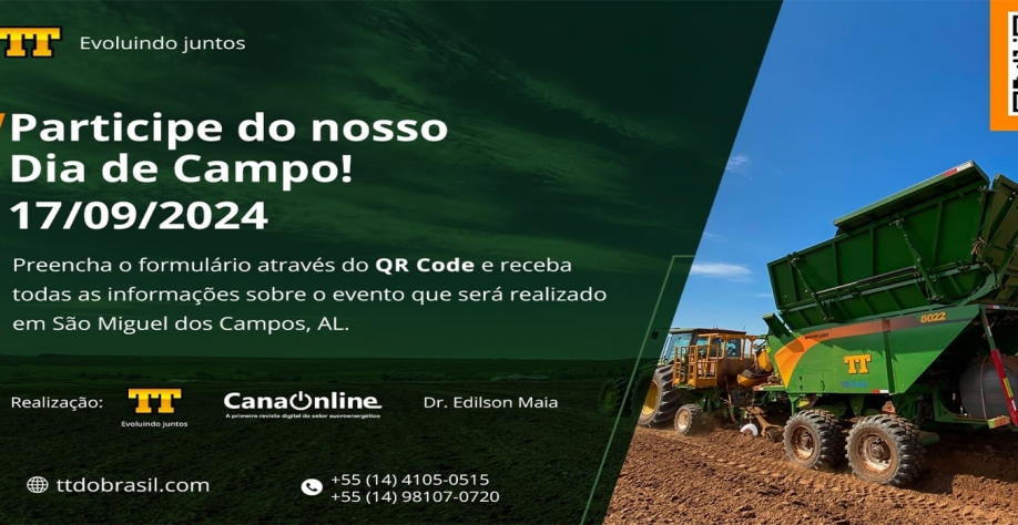 O evento acontece em 17 de setembro na fazenda Santo Antonio, em São Miguel dos Campos, AL, e o plantio de cana com plantadora automatizada será um dos destaques