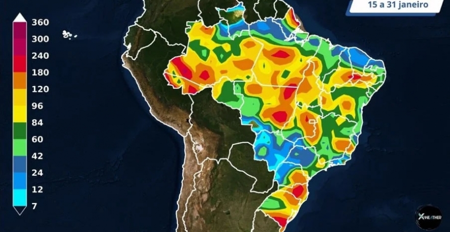 Janeiro ainda deve registrar muita chuva pelo Brasil. A partir da próxima semana, a precipitação acumulada pode passar de 100 mm em diversas áreas produtoras nas cinco regiões do país (manchas em amarelo e vermelho no mapa).