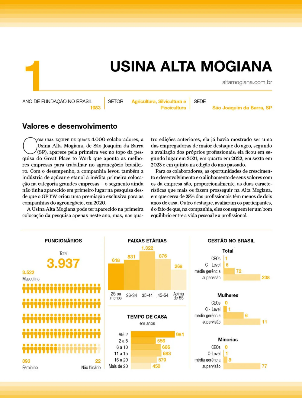 Com uma equipe de quase 4.000 colaboradores, a Usina Alta Mogiana, de São Joaquim da Barra (SP), aparece pela primeira vez no topo da pesquisa do Great Place to Work que aponta as melhores empresas para trabalhar no agronegócio brasileiro. Com o desempenho, a companhia levou também a indústria de açúcar e etanol à inédita primeira colocação na categoria grandes empresas – o segmento ainda não tinha aparecido em primeiro lugar na pesquisa desde que o GPTW criou uma premiação exclusiva para as companhias do agronegócio, em 2020.