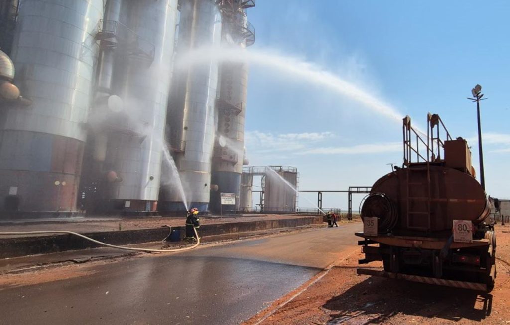Com o compromisso de fortalecer a cultura de segurança e a preparação das equipes para situações de emergência, a Usina Caeté – Unidade Paulicéia realizou, no dia 19 de setembro de 2025, um Simulado de Resposta à Emergência, com um cenário de princípio de incêndio e explosão nas colunas de destilação de etanol, na área industrial da unidade.