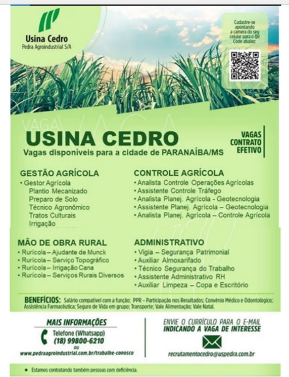 O Grupo anunciou o início das contratações em Paranaíba, com a abertura de diversos cargos entre os setores administrativo, produção e agrícola. Para concorrer as vagas os interessados devem mandar o currículo para o e-mail recrutamentocedro@uspedra.com.br. Dúvidas podem ser sanadas pelo telefone (18) 9 9800 6210.
