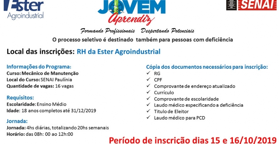 Home > Editorias > Vagas de Trabalho Cana Show-IAC 2025 Recursos Humanos Amigas e Amigos da Cana Campanha "Sou Sucroenergético" Açúcar, Etanol e Bioenergia pelo Mundo Artigos Bem-Estar Conjuntura Economia Eventos Fenasucro & Agrocana 25 Anos Fora do Trabalho Manejo Agrícola Mecanização Pesquisa e desenvolvimento ProÁlcool 40 anos Safra Sustentabilidade Tecnologia Agrícola Tecnologia Industrial Turismo Usinas Vagas de Trabalho Compartilhe: Usina Ester: programa jovem aprendiz 2020 14-10-2019 Formando profissionais - despertando potenciais Asplan orienta associados para participar de ação que fará a logística reversa de embalagens em Pedras de Fogo Brasil pode ter estiagem no Sul e invernada no Centro-Oeste durante a safra Hugo Motta defende ampliação da mistura de etanol na gasolina e reforça papel do Brasil na transição energética ANP divulga manual de orientações sobre solicitação de autorizações para produção de hidrogênio CRV Industrial promove SIPATR 2025 com foco em segurança e bem-estar no campo Corrida no Canavial 2025 reforça a importância da prevenção com o tema do Novembro Azul