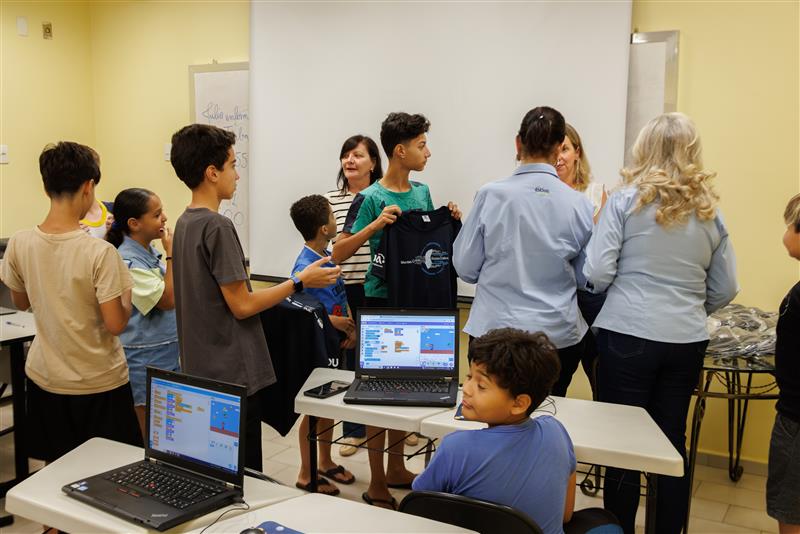 A oficina Mentes Curiosas e Robôs Criativos trabalhará robótica e desenvolvimento de jogos com os alunos na Assistência da Usina São José da Estiva. Alunos e professor receberam as camisetas personalizadas do projeto. A entrega aconteceu na tarde da terça-feira, dia 07 de outubro.