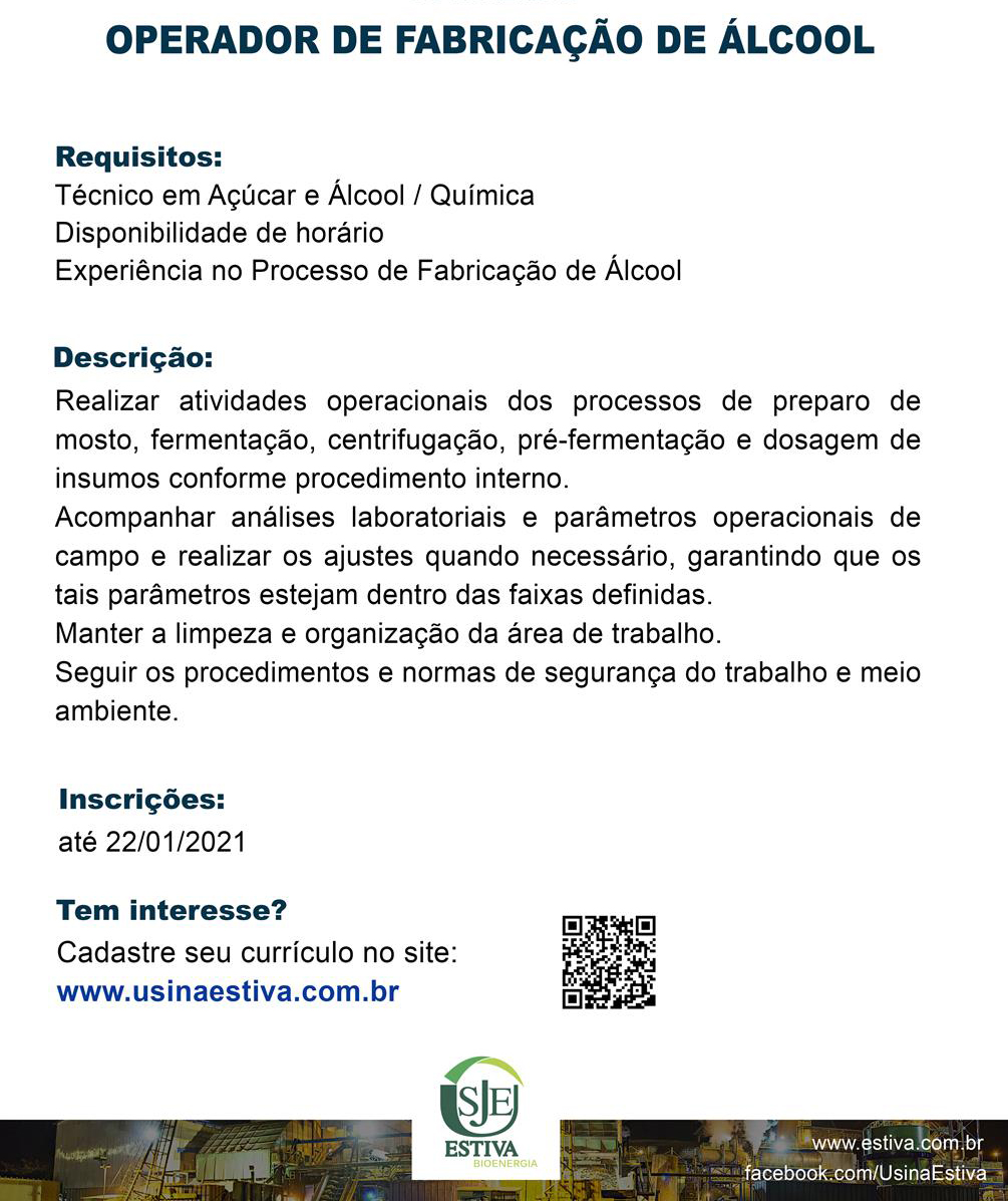 Usina Estivas contrata Operador de Fabricação de Álcool