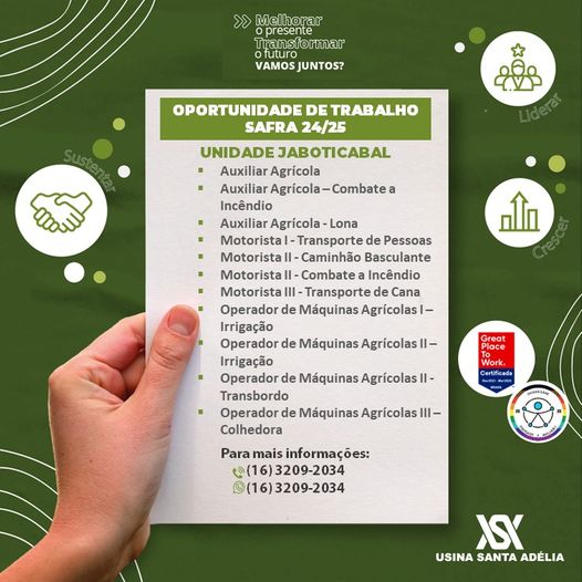 Confira nossas vagas para atuar na Safra 24/25, na unidade de Jaboticabal!