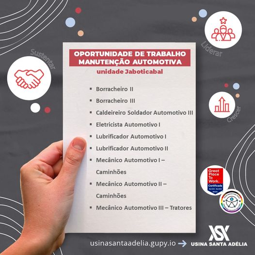 Lubrificador Automotivo I: https://usinasantaadelia.gupy.io/jobs/6767564