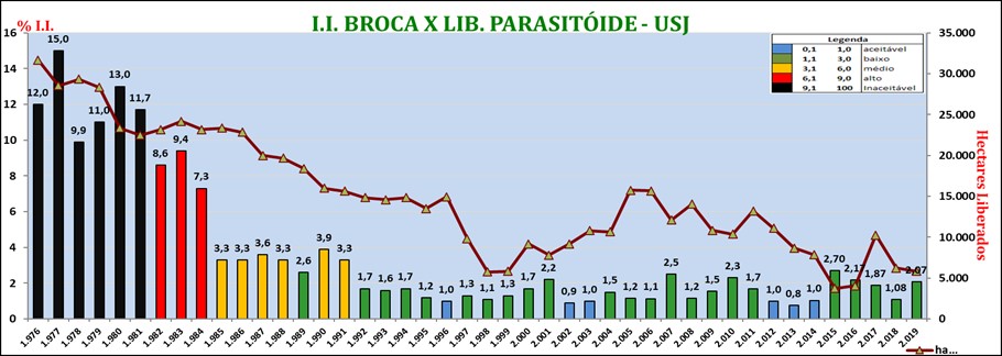 Gráfico: Índice de Infestação de broca e liberação de parasitoides nos canaviais da USJ