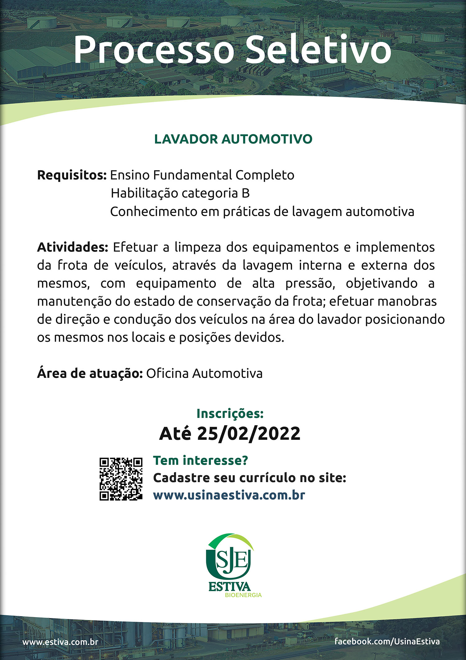 Home > Editorias > Vagas de Trabalho Cana Show-IAC 2025 Recursos Humanos Amigas e Amigos da Cana Campanha "Sou Sucroenergético" Açúcar, Etanol e Bioenergia pelo Mundo Artigos Bem-Estar Conjuntura Economia Eventos Fenasucro & Agrocana 25 Anos Fora do Trabalho Manejo Agrícola Mecanização Pesquisa e desenvolvimento ProÁlcool 40 anos Safra Sustentabilidade Tecnologia Agrícola Tecnologia Industrial Turismo Usinas Vagas de Trabalho Compartilhe: Usina São José da Estiva contrata Lavador Automotivo 16-02-2022 A Unidade está localizada em Novo Horizonte, SP Cana-de-açúcar impulsiona o desenvolvimento de Uberaba e região Compromisso social: Usina Caeté celebra a conclusão de mais uma turma do Programa de Aprendizagem Açúcar: o mercado prende a respiração Ação de recolhimento de embalagens plásticas usadas em Pedras de Fogo arrecada 2,2 toneladas em apenas um dia Usina Estiva: Manejo de pragas e doenças da cana é tema de treinamento TIM impulsiona digitalização do agro com IoT e 5G e mira eficiência do campo ao porto