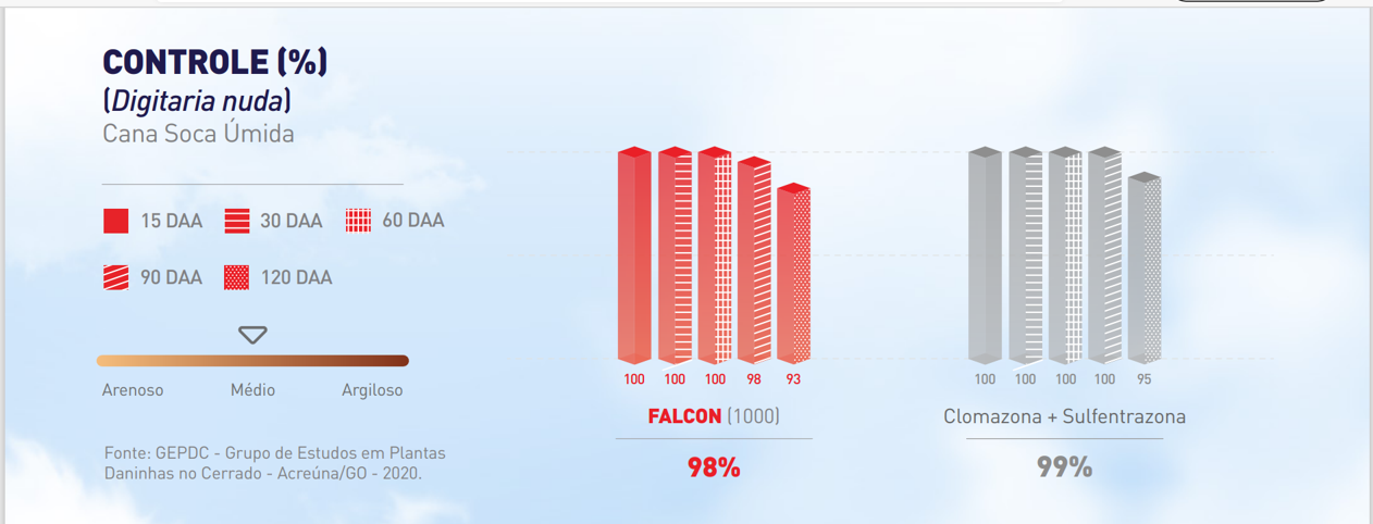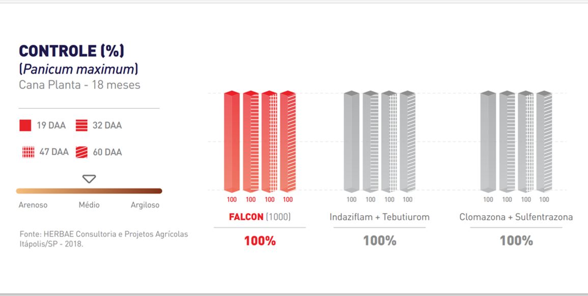 No tocante aos herbicidas pré-emergentes, recentemente a lavoura canavieira recebeu uma ótima notícia: a IHARA desenvolveu um produto específico para o controle de plantas daninhas em cana-de-açúcar, o FALCON, uma tecnologia exclusiva que oferece amplo espectro de controle de daninhas de folhas estreitas e largas, assegurando seletividade, ou seja, controla as principais daninhas sem prejudicar o canavial. E pode ser aplicado em todos os estádios de verdade.