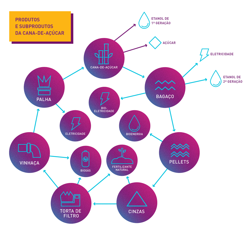 Além de matéria-prima para a produção de açúcar e álcool, os subprodutos e resíduos da plantação são utilizados para geração de energia elétrica, biogás, fabricação de ração animal e também fertilizante para as lavouras.